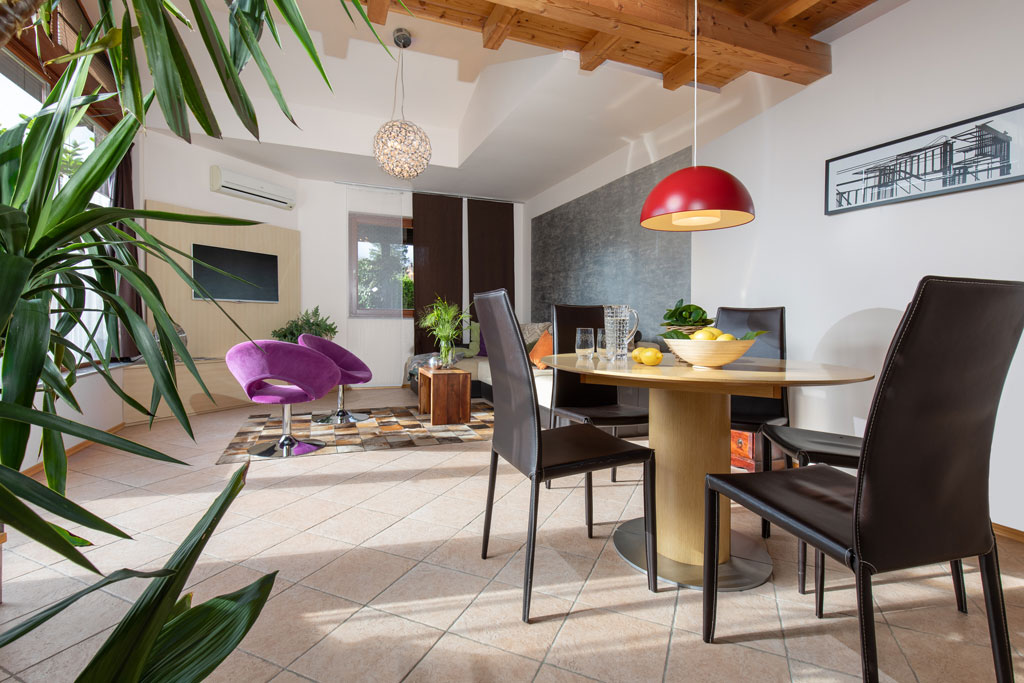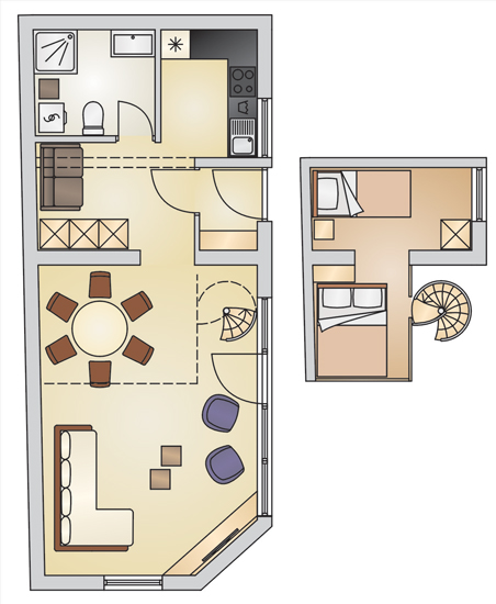 Ampio spazio soggiorno-letto con sala da pranzo, stanza con un letto singolo, piano supperiore con letto matrimoniale, loggia con divanoletto e guardaroba, cucina moderna e funzionale, terrazzo (45m2).