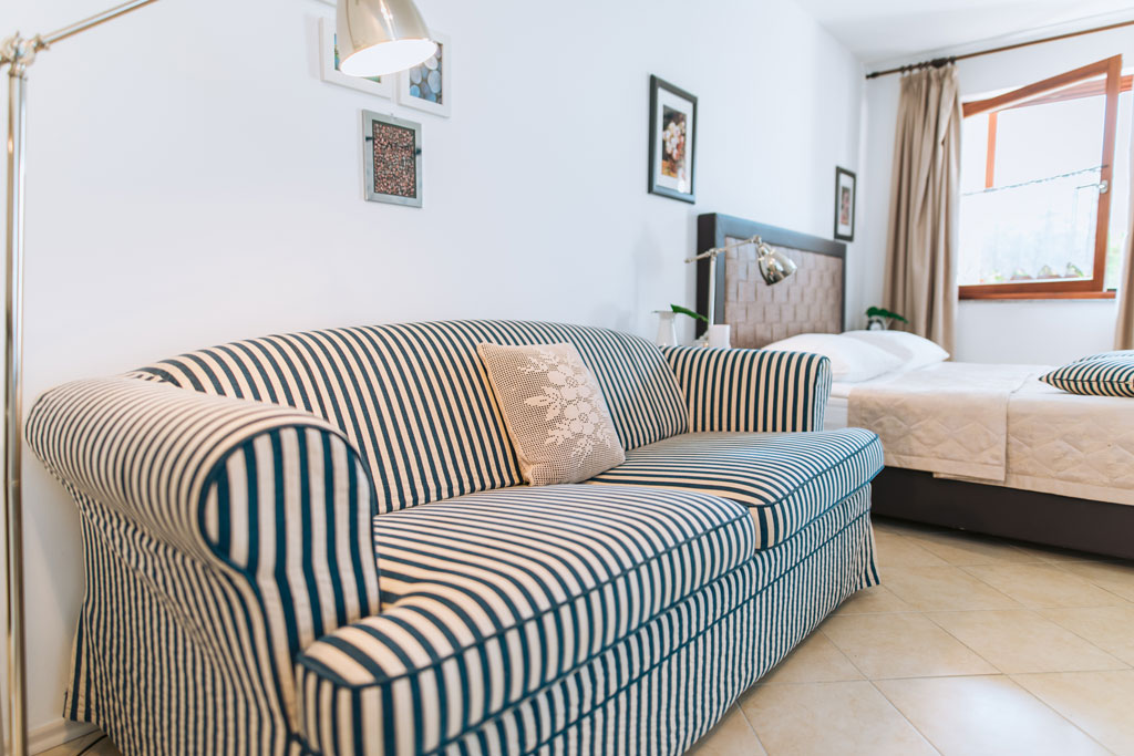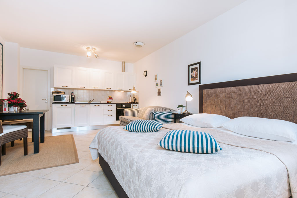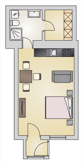 Appartamento-studio (45 m2) con domesticita' unica, comfort ideale per due persone (zona soggiorno-letto, bagno, guardaroba).